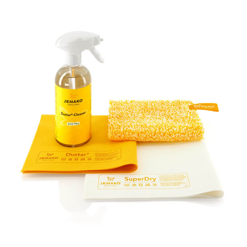 JEMAKO Küchen-Set sanft+ Für die Reinigung und Pflege Ihrer empfindlichen Hochglanzküche, ist das Küchen-Set Sanft genau die richtige Wahl. Das Küchen-Set Sanft ist ideal für: Hochglanzfronten Lackoberflächen Dieses Set besteht aus: Dustar®-Tuch, 35 x 40 cm Dustar®-Cleaner, 500 ml Schaumpumpe Abledertuch SuperDry weiß/gelb 40 x 45 cm DuoTuch 18 x 24 cm, gelbe Faser in praktischer Klickbox verpackt Bei diesem Artikel handelt es sich um ein Plus-Set. Wählen Sie zusätzlich ein Basis-Set, können Sie sich einen  Kraftreiniger, 500 ml + Schaumpumpe, weiß gratis  sichern! Bitte beachten Sie stets vor der ersten Anwendung unsere Anwendungs- und Pflege-Hinweise !