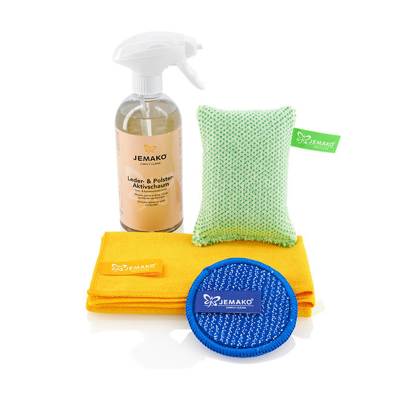 JEMAKO Wohn-Set Polster+ Das perfekte Set für die schnelle, gründliche Polster-Reinigung. Ihre Vorteile: Reinigt textile Polster schnell und gründlich Löst hartnäckigen Schmutz und Verkrustungen Ideal für: Textile Polster Flusen-Entfernung aus Polstern und Teppichen Schuhe (Wildleder/Stoff) Dieses Set besteht aus: Leder- & Polster-Aktivschaum, 500 ml Schaumpumpe, weiß Reinigungsschwamm Kurzflor, grüne Faser Profituch Plus, M, 40 x 45 cm, gelb DuoPad mini, blaue Faser Klickbox Bei diesem Artikel handelt es sich um ein Plus-Set. Wählen Sie zusätzlich ein Basis-Set, können Sie sich einen Geruchsentferner, 500 ml + Sprühkopf, grau gratis sichern! Bitte beachten Sie stets vor der ersten Anwendung unsere Anwendungs- und Pflege-Hinweise !